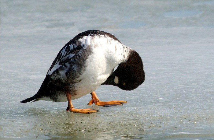 Let’s segue into winter with another bird picture. A young male Common Goldeneye on the ice.