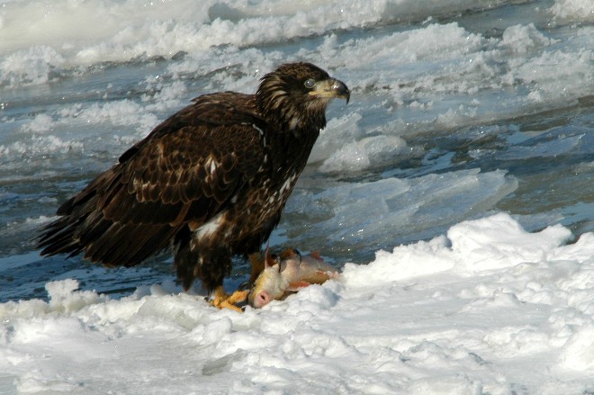 Sushi Or Not?: It’s easy to look at this winter scene and think how nice it is that this young Bald Eagle will not go hungry. The truth is there were about 400 eagles that were pulling fish out of the river on almost every attempt. The temperature was -5 F and this was the Mississippi River in Illinois.
