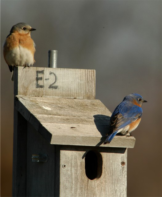 Shopping For a New Home: This Eastern Bluebird couple appeared to be shopping for their dream house. They decided on the pre-fab model. There were six or so pairs of Tree Swallows near-by, who were also looking for a house.