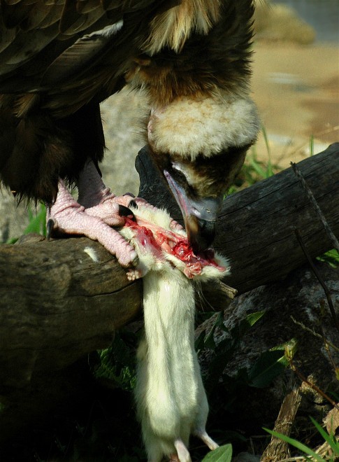 The job of a wildlife photographer is to tell the story of wild animals. Part of that story is the gory details of predators and scavengers as they consume their prey. If you happen to be making pictures in a zoo, well then the story becomes what man feeds these animals when they are in captivity. In some cases, or at least in this case, they feed Cinerous Vultures white rats.