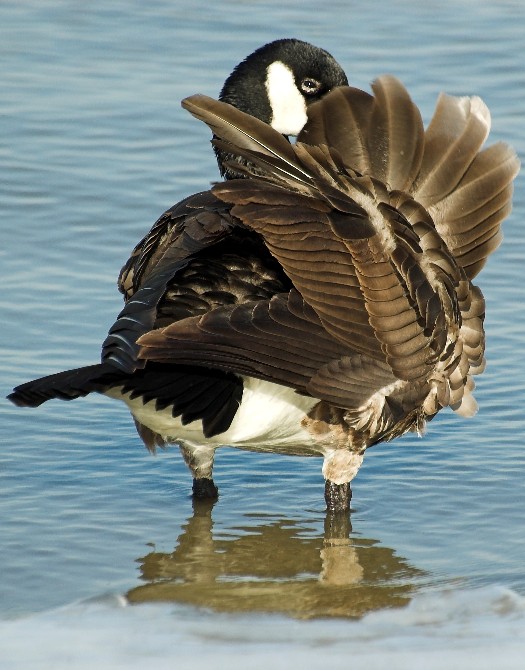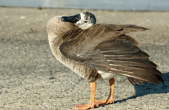 There is never a shortage of hybrid geese in this part of the world. I would guess this is a Canada Goose/Greater White-fronted, or Canada Goose/Snow Goose, or Canada Goose/ domestic? No Canada Goose at all? If there is a domestic component in this bird’s lineage, it did retain the ability of a strong flyer.
