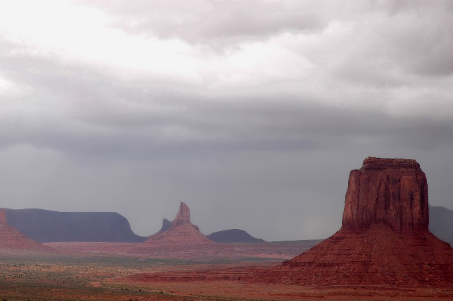 Desert Storm in Monument Valley  I have shared most of the images that I created on my single day visit to Monument Valley Utah/Arizona.  A great mix of sunny blue sky images, sunset photos and storm shots.  In some ways I think the storm images are the most powerful.  There is something about being caught in a storm in the middle of a desert valley that is eerie.  Admittedly we never even got wet, but it was still eerie.  I think the first shot below carries a great mood to it.  I like the way both the storm and the landforms are spread out.  You are forced to look through the rain in order to see the land.  The land itself remains somewhat dark and mysterious.18cDSC_2522