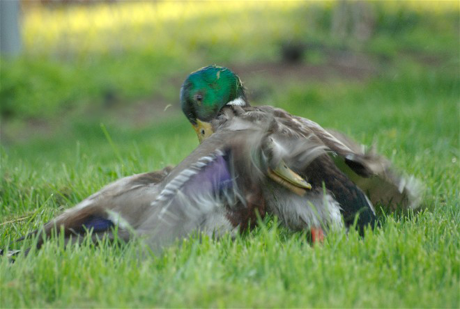 The back story to the Mallard images is interesting.  I headed out my door, camera equipment in hand, headed to Bong State Rec. Area for a day of bird/mammal/turtle/frog/insect/flower/sunset photography.  Just a normal day for me.  There were four Mallards, three males and a female in my backyard.  Two males were fighting viciously, while the female (the center of interest) and the more timid male watched.  I set up my camera low to the ground and clicked to make my somewhat interpretive images. They started to settle down and I left.  After I left, my sister let her two and my one dog outside.  A commotion ensued.  It seems that the two warriors and the female lifted off at the sight of the dogs, but poor Herman, the timid one was a bit too slow. One of the dogs caught Herman.  My sister screamed at them and poor timid Herman was set free.  At first he appeared to be injured as he hid under a bush instead of flying away.  He showed no sign of physical injury and once he got his breath back he flew away.  All’s well than ends well.