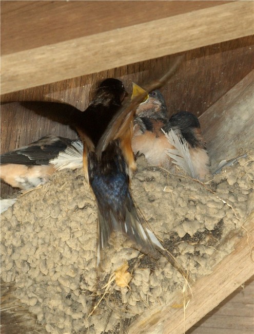 Feeding Frenzy.  Barn Swallows  I love watching Barn swallows and other swallows feeding their young.  Most are communal feeders and sometimes the adults sit in a line waiting their turn to feed the babies.  Usually they feed while they remain in flight.  I have even seen “fly by” feedings where the adult never really stops.