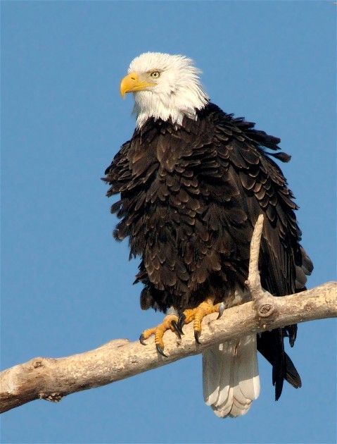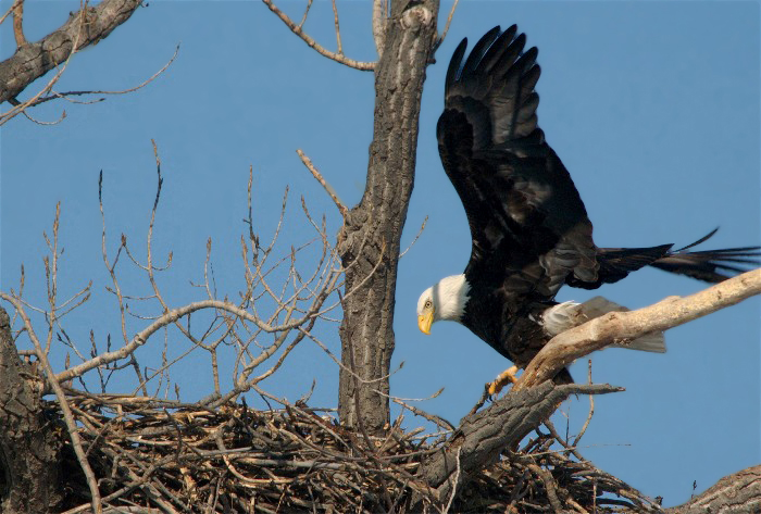 In my last post I showed some Bald Eagle pictures that had languished in my files because they were simply too cluttered in their appearance. I finally decided to put them to some use and show them to help make a point. Below we return to the “clean and simple” or “less is more” philosophy. I have shown images with eagles on the branch you see below many times previous to this. What I have never mentioned before, is that those images are of two separate birds. They are a mated pair. I have also never stated that their nest is just a little below where the bird is in the photo. In the third image I show both birds and the nest. The perched bird and the bird on the nest do work well together compositionally, but that darn branch runs directly in front of one parent! The final image is one parent returning to the nest. Neither nest photo has been shown before. They are not of the clean and simple genre but are a necessary part of wildlife photography.