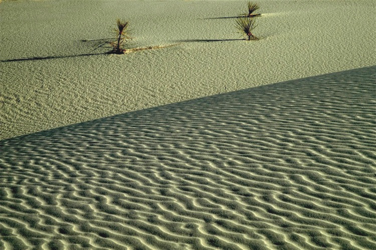 This photo originated on my final trip to White Sands New Mexico. As you can see I was shooting from one sand dune down to another. I used a small 60mm telephoto to achieve some minor compression. The angle where the dunes meet, the placement of the desert plants and therefore their shadows, were all important to me. There’s nothing like sand dunes to present the photographer with the purity of subject necessary, to work graphically instead of working by the knowledge and information about a subject. Both styles of photography are important but the freedom that this graphically pure form of photography provides us with, helps us to mature in both types of image making.