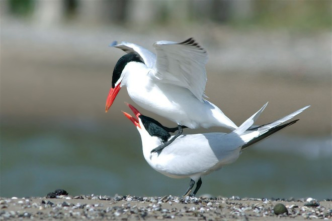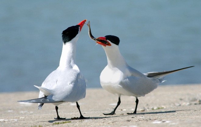One of my favorite parts of living along the shores of Lake Michigan has been all of those great birds that pass through in spring. One species that I have spent many wonderful hours with, is Caspian Terns. Even though most have just stopped to rest and feed on their journey north, they will court and mate while they are “resting”. The male purchases the affections of the female with a fish, and you can guess what follows. We humans have a name for that kind of action.