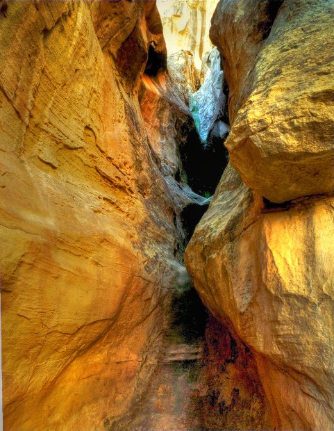 Wind & water. This small slot canyon was photographed at El Morro National Monument in New Mexico many, many years ago. El Morro is a great place with its share of landscape possibilities and a wall full of petroglyphs. Notice this slot is not as smooth and visually stimulating as many are that you see from Antelope Canyon and other prime locales. Also the light, which is entering from the far end, is not illuminating the slot in that beautiful way you see so often in slot canyon photos. I copied this slide a few years ago purposely to use on this blog to illustrate failures.
