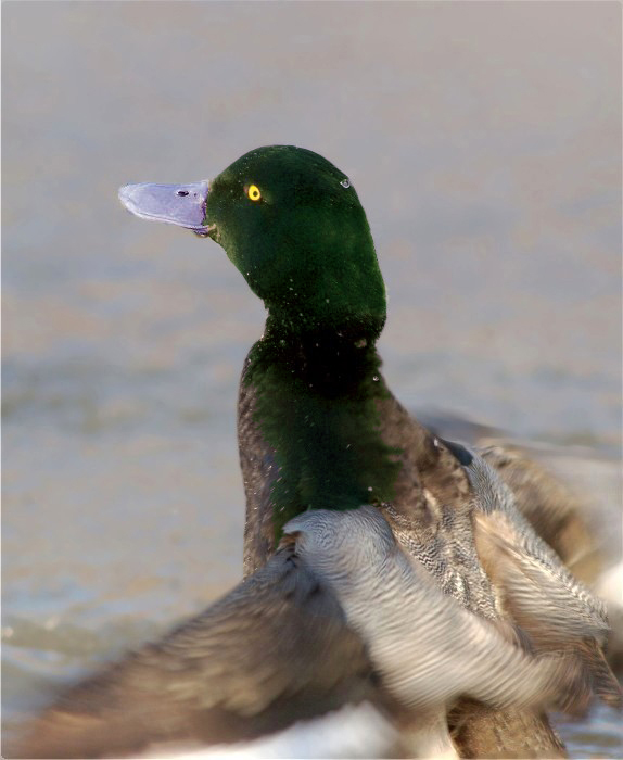 Hopefully images like this will never go out of style. The head, face and bill sharp, with out of focus and motion blurred wings. Throw in an unusual pose/composition and it is an image worth keeping. Male Greater Scaup.