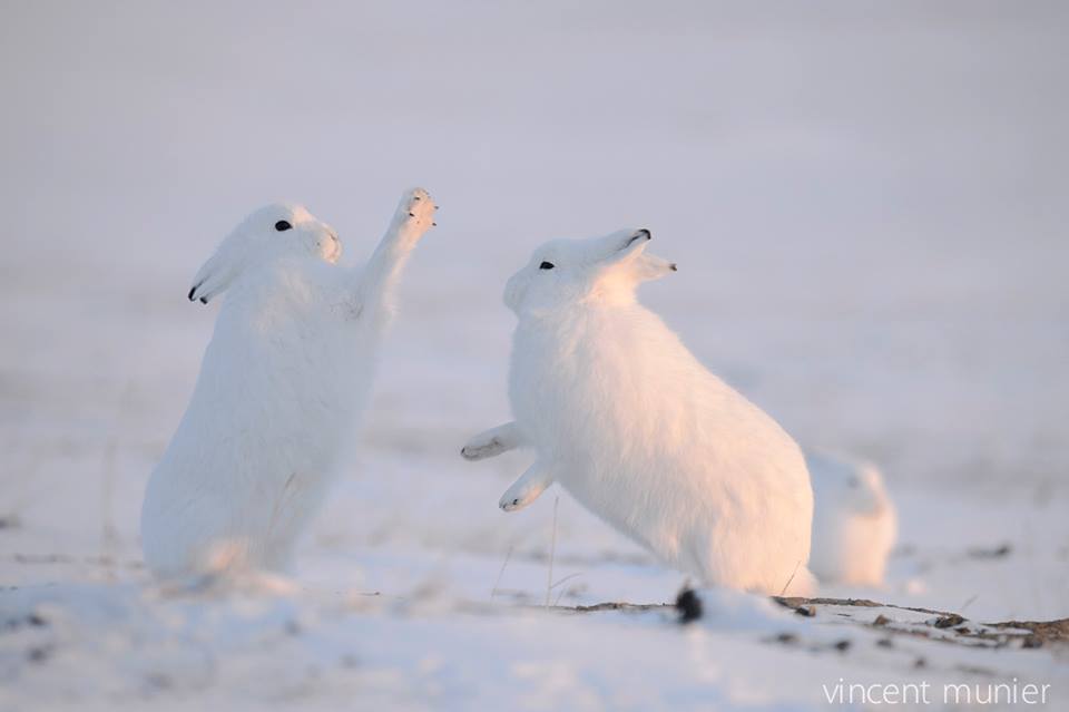 Vincent Munier was the photographer who made this great scene of two white rabbits sparring in the snow. It’s difficult to capture two up close animals in action and get them both in the picture frame. I always enjoy these white on white shots.