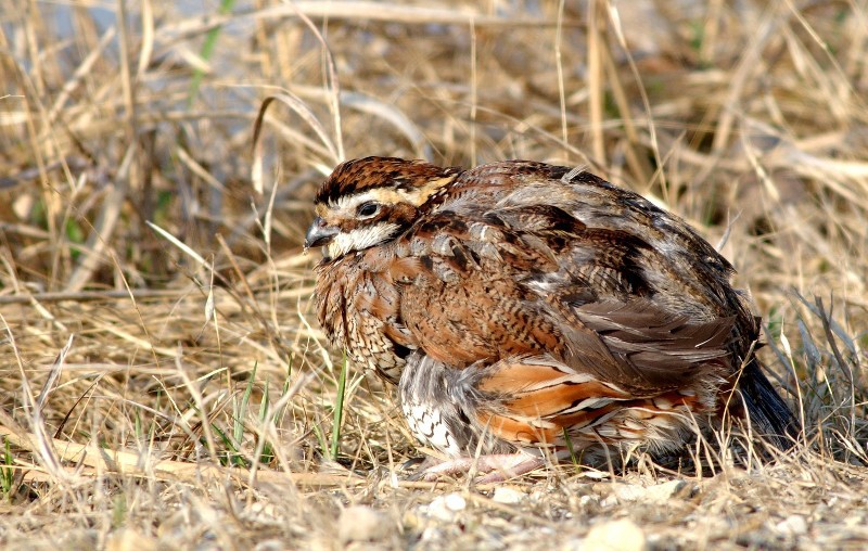 A bird that is considered uncommon, but is pretty common in the area of southern Wisconsin, is the Northern Bobwhite Quail. They have a fairly large breeding population here. The population is replenished by the use of this species in the sport/competition of field dog trials. They are raised and then released by humans. The dogs are then judged by their ability to discover the bird, and then to point or set. They are rarely recaptured and they go on to develop a breeding population, although they can be hunted during small game and pheasant seasons. They are also naturally indigenous to this area, so I am not quite sure whether this is a released bird, one that is the offspring of released birds, or a natural descendent of a wild population. He was certainly easy to photograph.