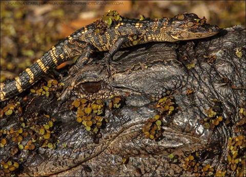 Once again we have a Marina Scarr photo. She is becoming a regular on these pages. She did a great job capturing this image of a baby gator riding on its mom’s head.