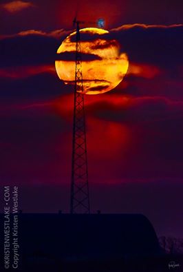 “Last night’s Full Moon rising. This isn’t the eclipse moon, but rather the full moon rising last night. It’s just off the horizon here so the color of the moon is intensely yellow/orange/red, picking up the earth’s atmosphere. As it gets higher from the horizon the moon appears white against the dark sky.