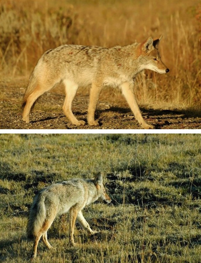The three coyotes you see in the pictures below, are all the same animal. They were taken only a brief few minutes apart. The top picture was made in the golden first light of the day. The coyote is lit evenly. He is a pretty critter in pretty light. The third photo was made almost immediately after the top one, but my subject was on the move and the direction of light changed. The light is still warm but at this angle it does leave the coyote in both sun and shade. The middle photo was made a while afterwards. The warmth of the light is fading and my subject is once again “almost” front lit. I actually like all three of these photos but the bottom image with the contrasty light is my favorite. By any normal rules of photography, a contrast filled scene like this, made of an animal, is a no, no. I love the hunting pose here and I think the image works as his body weaves in and out of the sun . I of course love shadows when they fall in the right places. The shaded side still carries detail, and the light is still warm, telling us what time of day it is. Rules are important but sometimes photographic rules need to be broken.