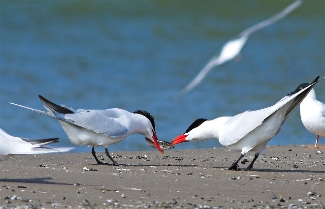 These Caspian Tern images were posted once on my old website. I removed them because they were busier in the background than I had first noticed, and that background was also incredibly noisy. Now let me say that the busy background is a good thing in the first picture. The sharp tern is up front and the remaining birds disappear softly into the background. That is an effective image and I over reacted the first time around. The two chopped off birds in the second photo are bothersome and who needs the head of that gull peering into a scene of intimacy between those terns in the final image. Of course wildlife photography sometimes just is what it is. As the years wore on I made more and more images of Caspian’s courting, mating, and other activities, that met my standards. The better software programs available helped me to remove the background noise a little more effectively for re-showing you today.