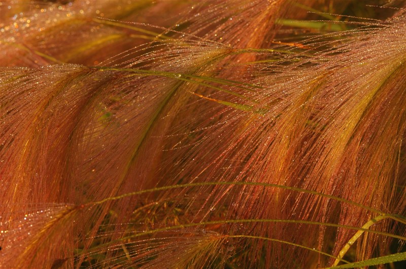 One of my favorite subjects in the world is grass. I am speaking of photographic subjects of course, and not the type of grass that’s smoked. At least as far as I know. Among grasses, I love Foxtail Barley grass the most. In particular, in late summer when it turns the color of rust. Add the sweet light of sunrise, and a few drops of morning dew……well you get the picture. Four of them in fact. Abstractions no less.