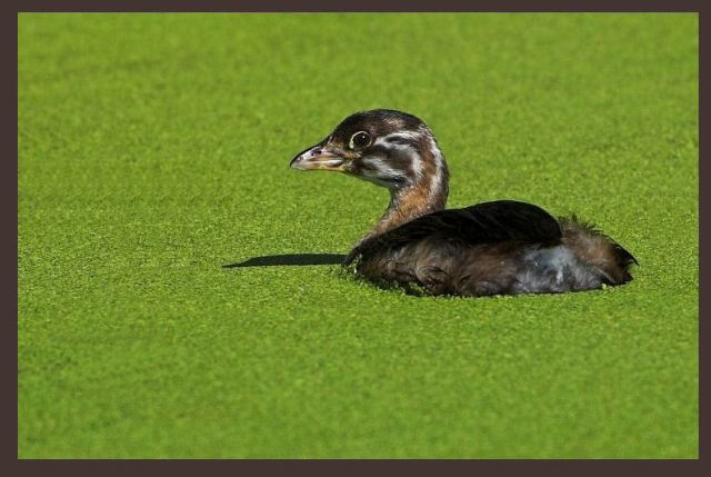 Grebes and Mergansers are certainly superb subjects and they have the bonus (for us) of being diving birds. This little Pied-billed Grebe managed to dive whenever it was somewhere where I couldn’t get the picture. I forgave my little friend as she/he flew over the small bank into a perfect pond of Duckweed. Soon after this the bird left, so I gave thanks and moved on.