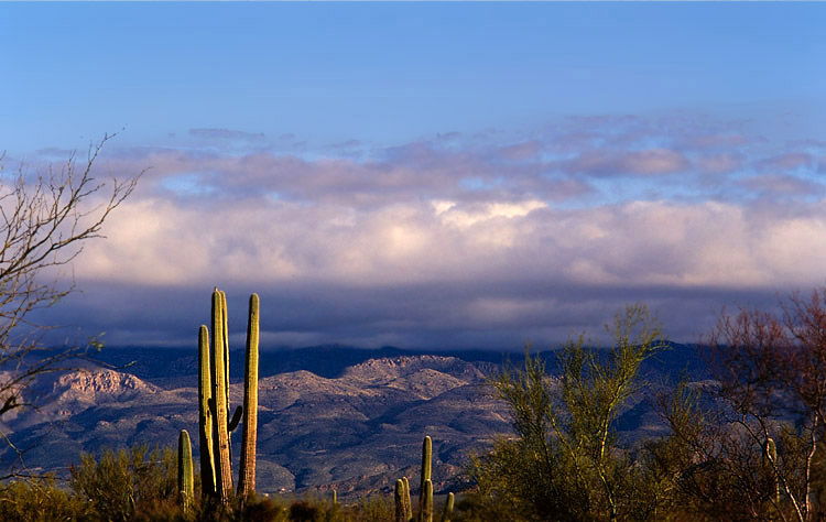 The “pinkish” clouds and mountains, along with the spotlight gracing the cacti, give the image enough of a boost to share with others.