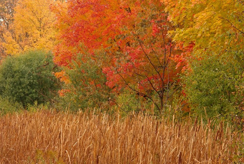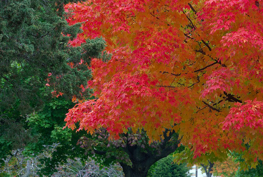 Of course, some trees are forever green (conifers) and they can be used to layer warm (red, yellow, orange) and cool (green) together for much of the fall season.