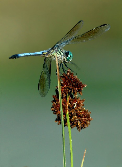 This dragonfly came and went to and from this perch for what seemed like at least ten times. It would stop and go again in only fractions of a second. Oft times it barely stopped and would fly again. I pre-focused on the tip of the plant, and then pulled the trigger every time it landed. I missed most of those chances. The best shutter speed and depth of field combo I could manage was 1/125th sec. at f/13. Fairly slow and fairly shallow. Eventually it sat for a while, maybe one second, and I managed to get one useable frame.