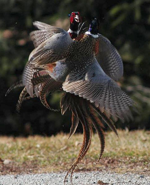 My subjects here which are male Ring-necked Pheasants, grew weary of this very violent fight and gave up without (if memory serves) ever accomplishing what they hoped to accomplish, with the hen that is just out of camera view.