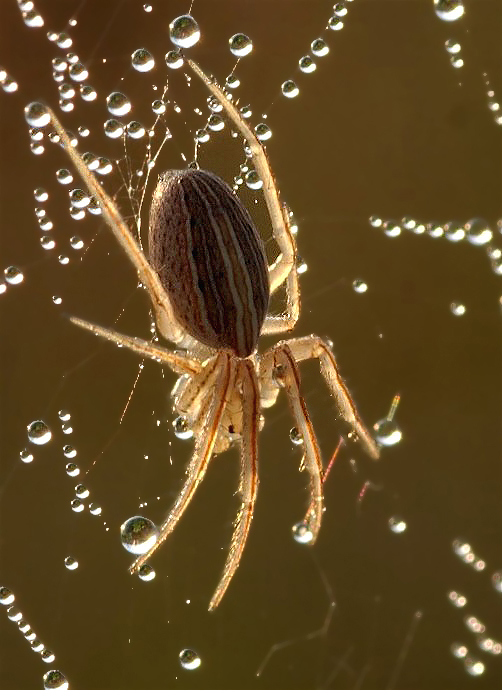Once again my 105mm macro was used along with a sturdy tripod. One of the hardest parts of making an image like this is that those strands of dewy orb web are touching plants all around you which are in turn touching other plants and on and one. A very cautious, slow, methodical approach is necessary to complete the task without knocking off the dew, breaking a strand of web, or even knocking your main subject of its perch.