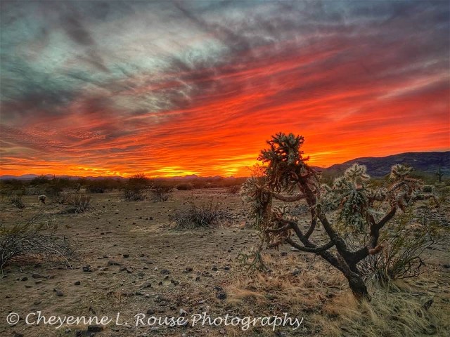 Our first photographer is a Facebook connection and her name is Cheyenne Rouse and she is a superb photographer/artist. I know not whether the image below was taken at sunrise or sunset, or in what part of America’s desert southwest she was in when she created it, but WOW!! It is not only spectacular but notice how she has kept the light in those beautiful skies low and moody, while still maintaining nice detail in the foreground. It is also compositionally excellent.