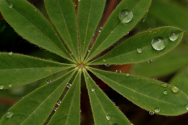 When I realized that there was a “whole lot of dew going on” one summer’s morning, I headed for a patch of Lupine plants.