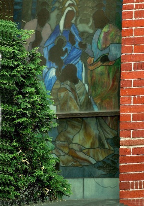 When I photographed scenes that were not truly nature, I composed as if it was. This image contains a portion of a tree, a stained glass window, and some brick from the building that housed that window. I just thought of it as a tree, some flowers and a rock form.