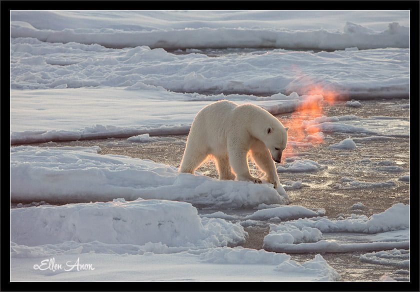Below we have an image from Ellen Anon of a Polar Bear in its typical habitat. The fact the there is “breath steam” rising from the animal’s nostrils and that the steam is colored by the rising sun, brings forth the “art of wildness“.