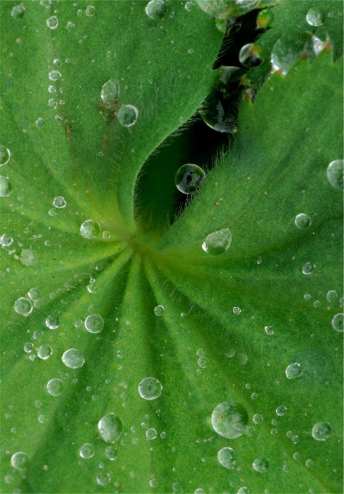 This close-up of a dewy plant, is almost an edge to edge picture. The opening in the plant transforms this image from such. There is a visual break in our journey. Just the same, nothing shows at the edges which would then place this plant in the context of its environment. We know nothing about where it lives. Like most macros, this image is intimate, but the story only carries so far.
