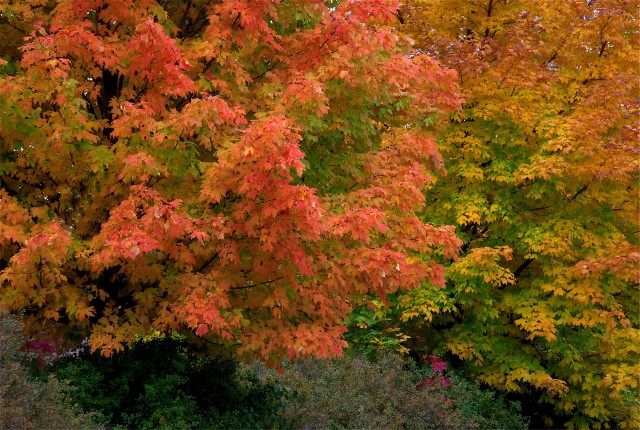 There are no true horizons in this photo of some autumn trees. Just the same, the changes in color and tone, as well as shadows and highlights, gives this scene a dimensional appearance. It is not a single continuous tone. It has a beginning and several ends.