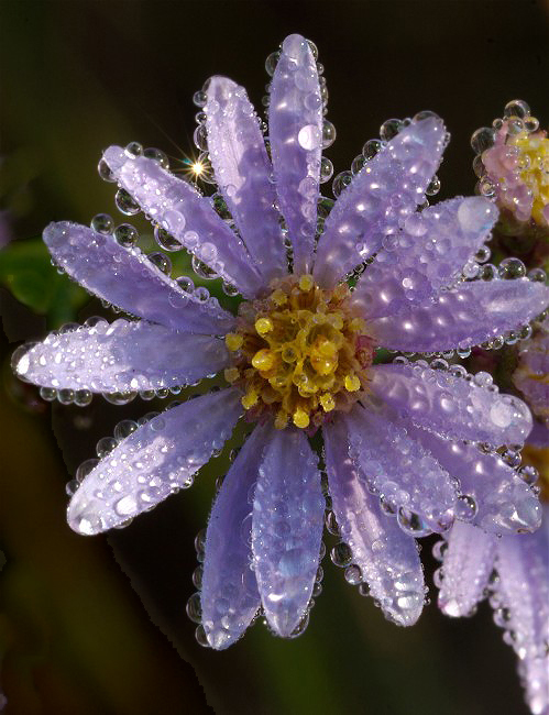 These Asters which flower out in early fall, are among my favorite subjects. Notice that this subject is in the morning sun. Fifteen minutes later and all of the sparkling dew would have been dried up. It can pay to get up early.