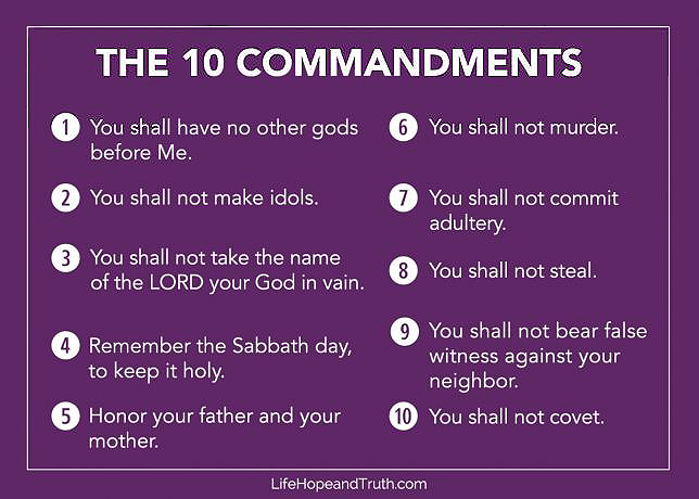 Below is a jpg with The Ten Commandments printed on it. It is a valid and good example because to me, even though some of the language may differ from say a King James Bible, it is accurate and easier to read. The Ten Commandments have been bastardized by many, including religions, to mean anything but what they said.