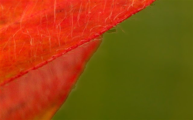 This leaf with an out focus green grass background, is pretty abstract. This is what I saw, so this is what you see. Part of the leaf is below but behind the main part of that leaf. My depth of field was shallow enough, that that one section of the photo is soft. It makes the image more abstract, and I kike that.