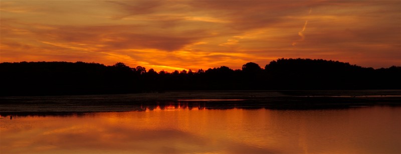 Images that are pretty much featureless, such as sunrise/sunset silhouettes, can be perfect for the pano crop. This images is divided into thirds. Two parts red, with the sky on the top (obviously) and its reflection on the bottom. And one part black, that being a row of trees on land. These shots work well un-cropped but often even better in the panoramic format.