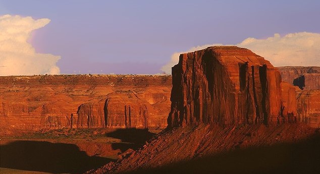 Two thirds (or thereabouts) land and one third sky often makes for a comfortable and beautiful scene. It did not hurt that those flecks of clouds in the sky, were nicely balanced within the scene, Also the warm rock and cool blue sky make for a sharp but comfortable contrast.