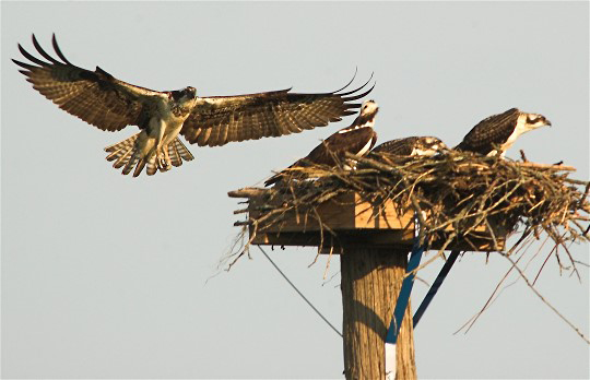 This is a mom and dad Osprey with babies at a man built nesting site. Just set up and wait, and the pictures will come to you.
