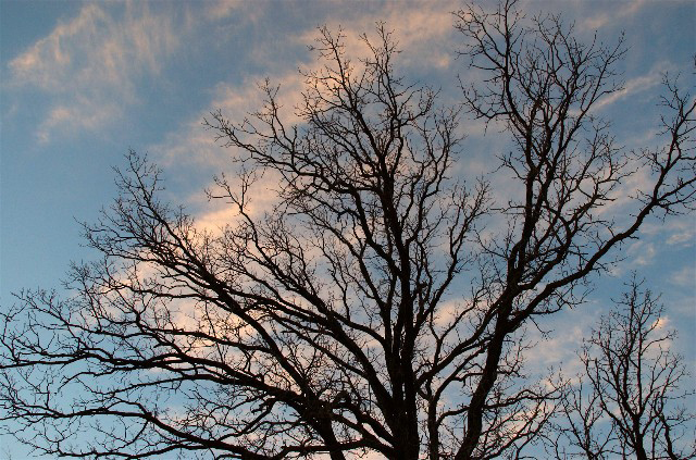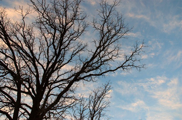 I love the shapes of nature and leafless trees are among my favorites. Normally I show off these craggy lines and designs in front of a sunrise or sunset, but variety is the spice of life. Some morning clouds with a blue-ish  sky made a pretty background for these branches.