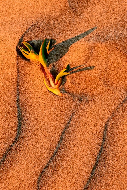 My guess is that photographer/artist Kerry Drager put no small amount of effort in being on this desert at the edge of light, while locating and composing an image of sand furrows that visually lead us to a desert plant. That low level side light also provided gorgeous texture. It looks good enough to eat. This image is both complex and simplistic at the same time.