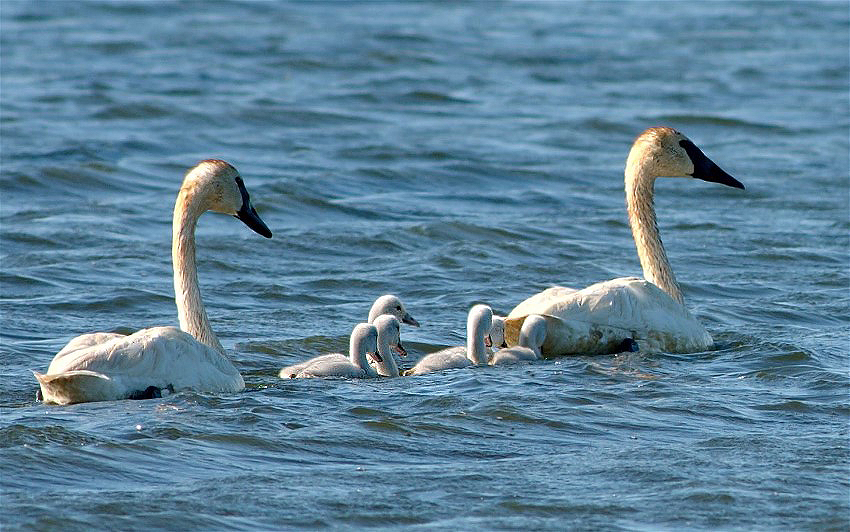 Family outings are always nice. Mom, dad, and the five little ones. Yes, there are five of them. The swans are trumpeters and as usual, I gave thanks and moved on. The location was Horicon Marsh NWR in Wisconsin.