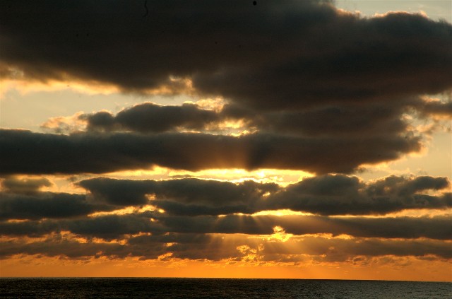 I have shared with you a lot of sunrise/sunset images on these pages. Most have been dominated by spectacular colors. Sometimes sunrise/sunset photos can have less than spectacular color, but can still be very powerful in their mood. Things like powerful mixes of light and dark, and ominous and even scary clouds can become the focal point and the “mood creator”. Metering off of the brighter parts, will keep your exposure down, leaving you with dark clouds and silhouettes of the land.