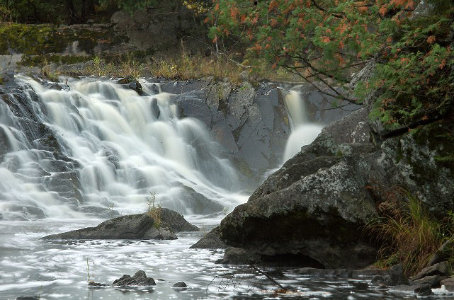 I don’t know how many waterfalls I have photographed in my life, but it seems as though I have been attracted to every drip of water I ever saw. A fairly violent little waterfall in northern Wisconsin has been visually tamed by the anchor (contrast?) provided by the rock and the trees. Memory says that I went to much trouble to find a position in order to create the image.