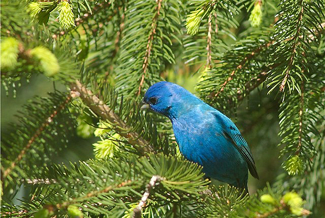 With spring comes birds that we only see for a few months a year. That is the case with the Indigo Bunting. Below we have the male of the species rummaging through the branches of a coniferous tree. I imagine he is hoping for an insect, but he settled for seeds at a nearby bird feeder.
