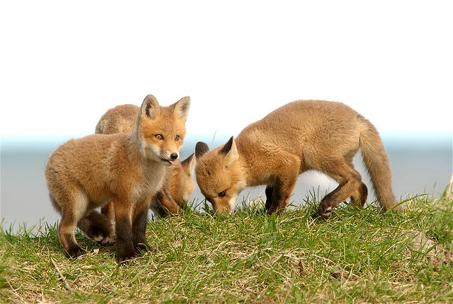 These three Red Fox siblings were having a great time investigating their surroundings, while both mom and dad supervise just out of camera shot. They are displaying their curiosity by using their noses. They are learning a skill that will serve them throughout their lives. It might save their lives one day, or that curiosity might just end it. Life is a gamble for wild critters.