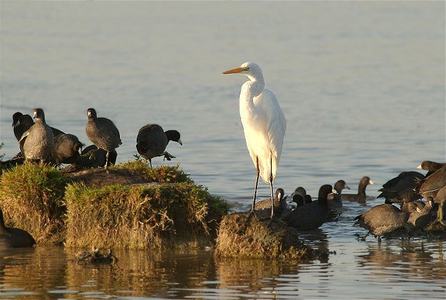 I feel so out of place. This Great White Egret is surely thinking that as it stands amidst a flock of American Coots. No bigotry here.