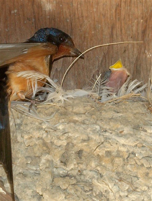 If you look carefully at this photo you will see that this Barn Swallow has been feeding a very hungry baby. This nest is inside of a picnic shelter. Watching Swallows feed is an amazing thing to see. All adults take part in the feeding and they will feed whichever youngster that they see begging for food.