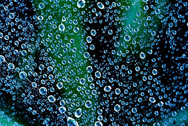 Spider webs with dew, work well with differing forms of light. This web was top lit. It was direct but fairly soft. I would have tried no matter what, but truly harsh light might have washed out the details of the droplets with the web.