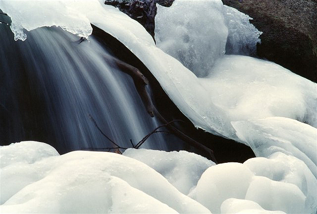 The soft feeling that we get from the lack of direct light in the ice image below, I think adds to the gentle, peaceful mood of this small waterfall in winter.