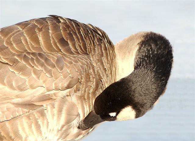 This Canada Goose is preening while at a snow covered parking lot. The sunlight is slightly top and to our right. That light, adds a dimension to this subject that would be shameful to have missed. From feather detail to beautiful contrasts.
